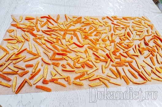 Готовим сироп: берем кастрюлю с толстым дном, 200 мл воды, 200 г эритрита (заменить нельзя!) и 50 г эритрит+сукралоза или другой сахзам, который слаще в 10 раз, чем сахар. Когда растворится весь сахзам и вода начнет кипеть, кладем кожуру и специи, и варим до полного выпаривания сиропа, у меня заняло 45 минут. Не мешать, просто слегла встряхивать или лопаткой отодвигать, и смотреть, есть ли сироп на дне. Как весь сироп выпарится, откидываем на сито. Стелим на стол пергамент и выкладываем готовую апельсиновую соломку на расстоянии друг от друга, чтобы не слипались, и оставляем на ночь. Утром просто собираем на тарелку, и они еще чуть досохнут в течение дня. Как вам понравится консистенция: кто-то любит прям сухариками, мне нравятся чуть мягкие, можно присыпать пудрой из сахзама по желанию. Приятного аппетита! Запинить