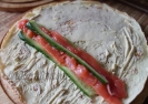 майонез (по рецепту Дюкана), малосольный лосось, свежий огурец. Описание и способ приготовления:Испечь блины. Приготовить майонез. Рыбу и огурец порезать на тонкие полоски.