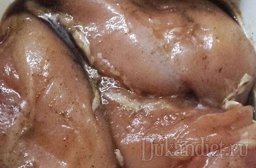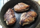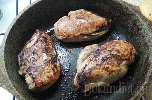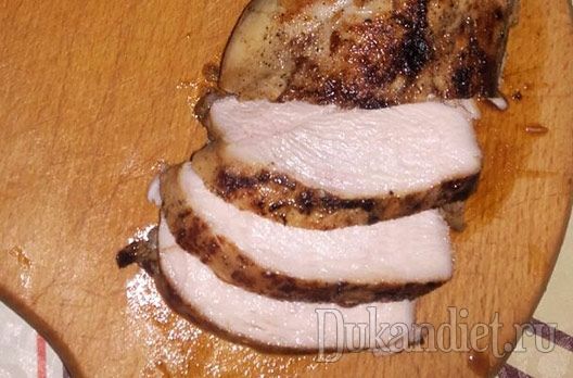 На хорошо разогретую сковородку, смазанную растительным маслом, выложить грудку и обжарить с двух сторон до хорошей румяной корочки. Выключить огонь (!), закрыть сковородку крышкой и оставить в таком виде на полчаса. Крышку не открывать – это важно!!! Через заданное время выложить грудки на тарелку, полностью остудить. Остывшие завернуть в фольгу плотно и убрать в холодильник минимум на 6 ч. Грудка очень сочная, но в то же время плотная, очень тонко режется, отвариванием такого не добьешься. Автор - Анжела Шумова. Запинить