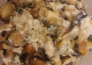 Нарезаем полукольцами лук и обжариваем несколько секунд на сковороде, смазанной растительным маслом с помощью силиконовой кисточки (капнуть масло и вытереть салфеткой). Выкладываем к луку мидии, солим, приправляем по вкусу. Обжариваем несколько минут, чтобы выступил и испрился сок. Смешиваем все остальные ингредиенты, кроме мидий, тщательно измельчаем и перемешиваем в блендере (у меня блендера нет, поэтому я просто мелко порезала бутончики каперсов и миксером все смешала). Заливаем мидии получившимся соусом, посыпаем сверху натертым Дю-сыром и ставим в открытой сковороде в духовку на 15-20 мин. при температуре примерно 160. Получается 3-4 порции вкусняхи. Запинить