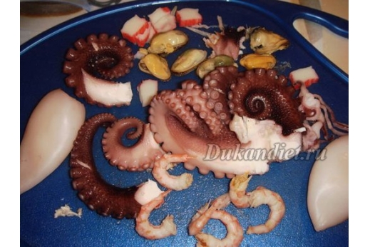 креветки, яйца, кальмар, красная рыбка, осьминог, мидии, петрушка. Описание и способ приготовления:Все сбрызнуть лимоном.