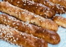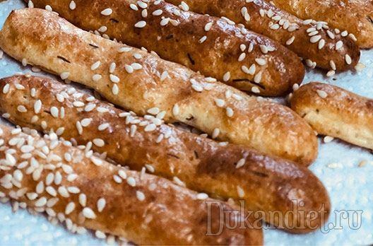 Подготовить противень. Лучше использовать силиконовый коврик (на пергаменте может прилипнуть). Выдавливайте палочки размером 5-15 см. Соблюдайте дистанцию между палочками, так как они во время выпекания будут увеличиваться. Выпекаем до румяной корочки. Для большего аромата можно добавить сырный аромик и смазать палочки чесночком. Запинить