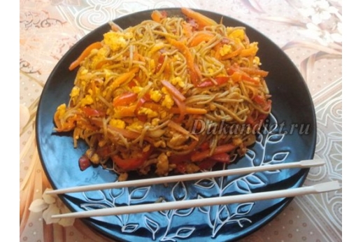 1 морковка, 1 лук, 200 г куриного фарша, 200 г собы (гречневая лапша), 1ст. ложка карри. Описание и способ приготовления:Фарш пожарить на тефлоновой сковородке. Перец, морковь, лук порезать соломкой и пожарить с капелькой масла. Собу отварить. Все перемешать, добавить карри, соль, и 2 ложки теплой воды.