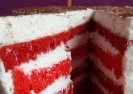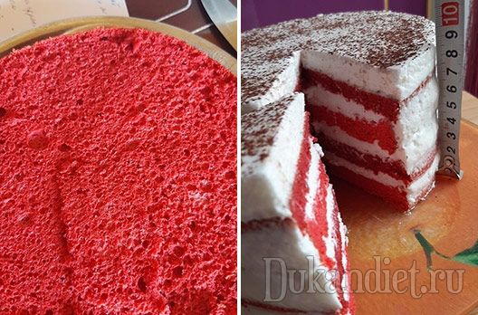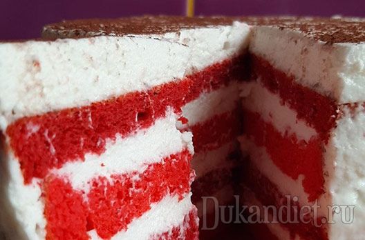 Торт «Красный бархат»Ингредиенты: 2 яйца сахзам ароматизатор «Вишня» красный краситель 1 ст. л. рисовых отрубей 1 ст. л. изолята 2 ст. л. сухого обезжиренного молока 1 ст. л. без горки пшеничной клетчатки (белой как пух) 1 ч. л. какао 1% без горки 1 ч. л. разрыхлителя 200 г творога мягкого «Савушкин» 15 г желатина Описание и способ приготовления:Яичные белки взбиваем до пиков.