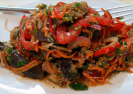 Закуска из баклажановИнгредиенты: баклажан — 4 кг, лук — 3 шт, морковь — 3 шт, перец болгарский — 3 шт вода (кипяченая) — 0,5 стак., сахарозаменитель, уксус — 0,5 стак., чеснок (1 головка), растительное масло (для жарки, если сковорода не позволяет жарить без масла) – 3 капли, соль (по вкусу). Описание и способ приготовления:Баклажаны порезать толстыми кружочками, посолить и оставить на полчаса-час, чтоб стекла горечь. Далее поджарить. Жарить нужно не до полной готовности, а слегка, с одной и с другой стороны.