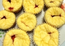 Смешать все ингредиенты для теста и разлить по формам для кексов. Если густо будет, то добавить еще кефира до консистенции бисквитного теста. У меня 10 шт. получилось. Нужно всего по ложке налить на формочку. Ингредиенты для начинки смешать и тоже по ложке столовой вылить сверху теста в форму. Ставим в духовку на 180 °C на 20 мин. Ориентируйтесь по своей духовке. У меня ушло 15 мин. Можно поставить на 160 °C, тогда минут 20-25. Выключила духовку, дала там немного остыть, не открывала. Потом уже вытащила на тарелку до полного остывания. На втором фото: сделала творожные кексы с сиропом "Вишня" + чуть камеди для загущения.